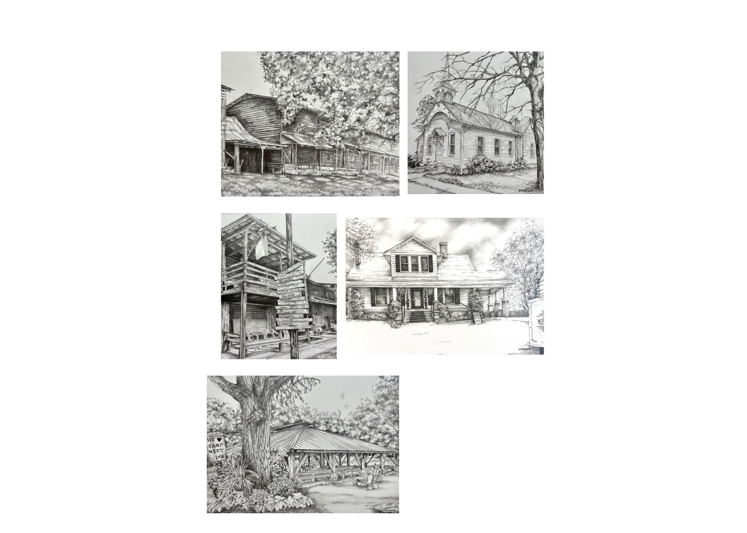 View a collection of pencil drawings of the historic Rock Springs Campgound in Denver, NC. From "The Arbor" used for worship since it was built in 1832 to the historic "Tents" passed down through the generations since that time. Browse through available options in the Architecture Collection.
